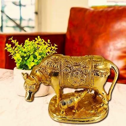 Brass Golden Cow and Calf Idol Statue for Home Temple Pooja Corporate Office Gift Item (16x13x8 Cm)